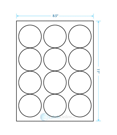 Sheet Size: 8 1/2" x 11" Label Shape: Circles Label Size: 2.5" Labels/Sheet: 12 Perforation: No Perf Compare to: Avery 5194, 5294