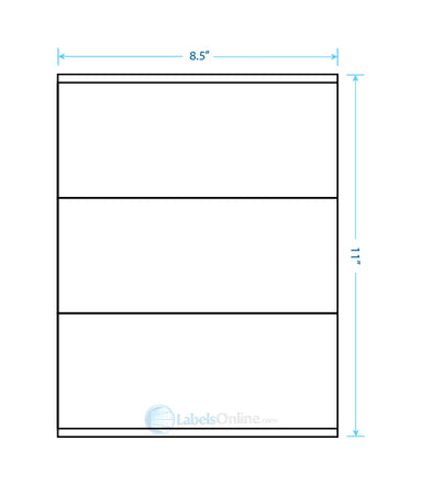 Sheet Size: 8 1/2" x 11" Label Shape: Square Corners Label Size: 8.5" x 3.5" Labels/Sheet: 3 Perforation: No Perf