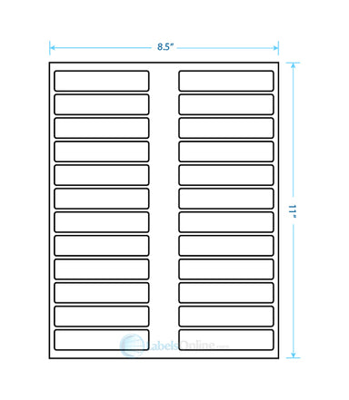 Sheet Size: 8 1/2" x 11" Label Shape: Round Corners Label Size: 2.5" x 1.125" Labels/Sheet: 24 Perforation: No Perf