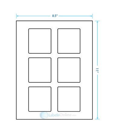 Sheet Size: 8 1/2" x 11" Label Shape: Round Corners Label Size: 3.25" x 3" Labels/Sheet: 6 Perforation: No Perf