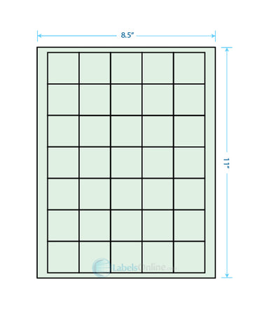 Sheet Size: 8 1/2" x 11" Label Shape: Square Corners Label Size: 1.5" x 1.5" Labels/Sheet: 35 Perforation: No Perf