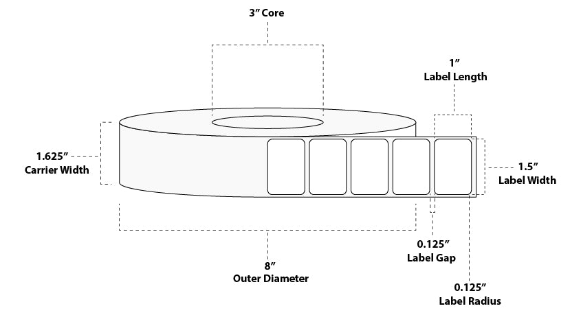1.5" x 1" Premium Thermal Transfer Paper Label; Perforated; 3" Core; 8" OD; 8 Rolls/carton (5,500 Labels/roll)
