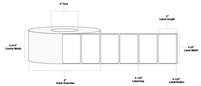3.25" x 2" Premium Thermal Transfer Paper Label; Perforated; 3" Core; 8" OD; 8 Rolls/carton (2,900 Labels/roll)