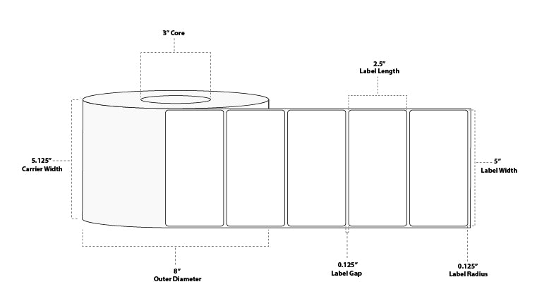 5" x 2.5" Premium Thermal Transfer Paper Label; Perforated; 3" Core; 8" OD; 4 Rolls/carton (2,500 Labels/roll)